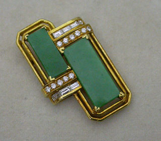 天然頂級翡翠A貨、玻璃艷綠、18K黃金打造幾何式樣、上鑲南非天然鑽石、鑽石皆白淨亮澤